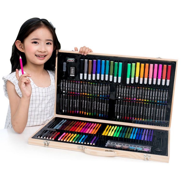 20 water colors markers,40 oil pastels,40 crayons,20 color pencils,36 watercolor pens,12 watercolor cakes,1 liquid glue,5 clips,1 pencil,1 brush,1 palette,1 sharpener, 1 ruler, 1 eraser.
